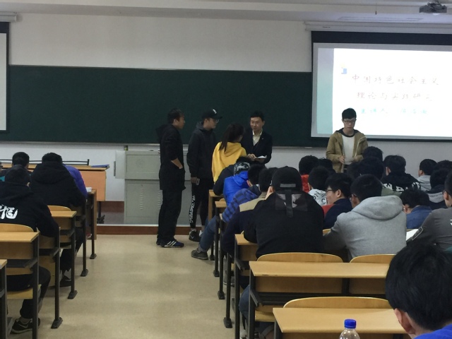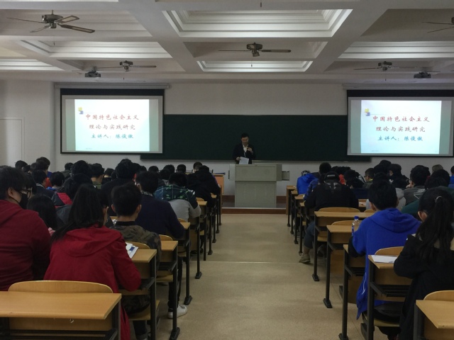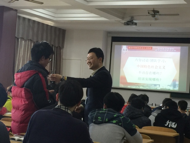 本学期,陈俊傲书记主要给学生们讲“中国特色社会主义理论与实践研究”。为了上好这堂课,课上他主动与学生们约法三章,以民主表决的办法提议学生自觉遵守课堂纪律。提议得到大多数学生支持。陈俊傲书记的课从来不拘泥,总有办法让学生喜欢上他的课。在学生眼里,这位陈老师相当和蔼可亲、风趣儒雅并能带领大家积极思考。他从历史变化、国际环境、科技、梦想等为切入点,让学生以小组讨论的形式,思考并分析“中国为什么会选择社会主义市场经济?为什么必须坚持党的领导,我们的社会主义才能有如此成就?”等问题,让学生们沉浸在学习的乐趣中意犹未尽。