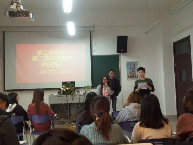 2017年11月6日下午,外国语学院与建筑工程学院的第二期中级党校开班典礼在2号楼408举行。建工学院党支部副书记江雪标老师和外国语学院黄杰老师先后为在座的16级入党积极分子进行培训。