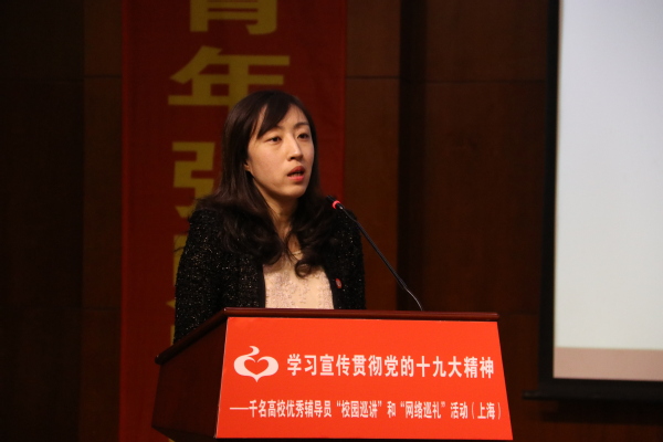 来自上海交通大学、上海财经大学、上海立信会计金融学院和东华大学的四位优秀辅导员武超、付卓婧、王珲和魏金婷,以他们在辅导员一线的经历和体会,从宏观的国际视野到微观的学习生活,从历史传统到新时代,结合党的十九大报告精神,用形象生动的典型案例,深入浅出地解读了习近平新时代中国特色社会主义思想的精神实质和丰富内涵。他们用饱满的激情和幽默风趣的语言,对十九大精神中的新时代、新思想、新判断和新征程等进行了系统梳理和深入解析,赢得全校师生的阵阵掌声。