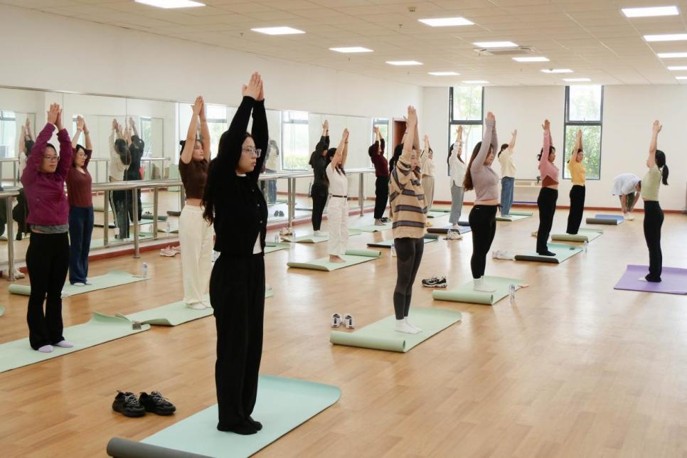 教职工们跟随着教练的节奏,时而伸展肢体,时而静坐冥想,全身心地投入到瑜伽的世界中。老师们汗水与笑容交织,疲惫在这一刻得到了释放,彼此间相互了解。