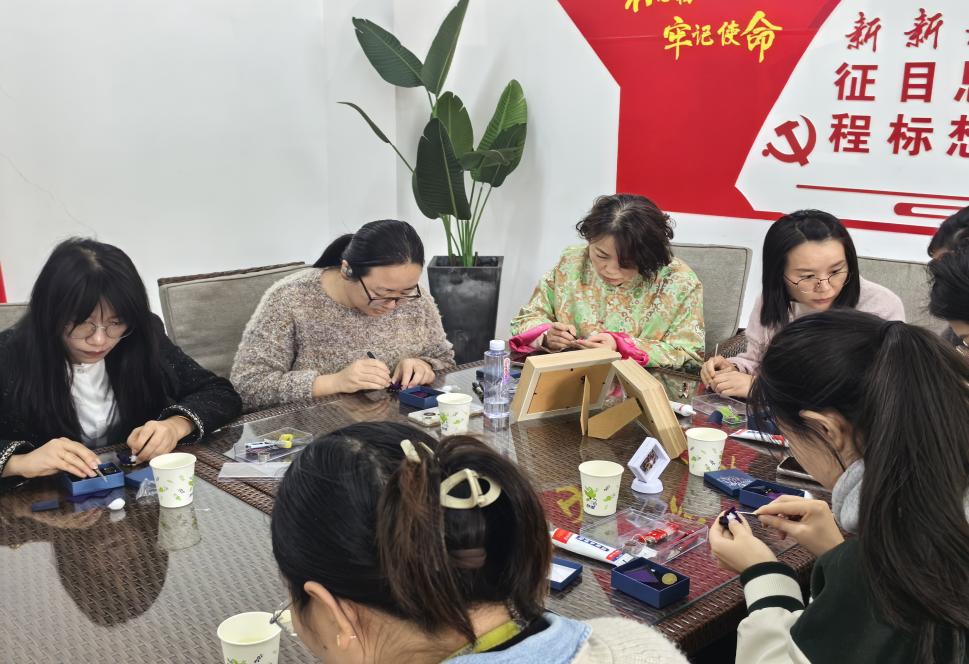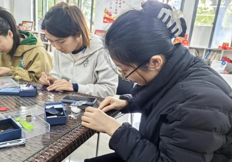 制作环节中,教师们全情投入,每一步皆需专注与耐心。在示范过程中,张老师将丝线于指尖灵动穿梭,然后裁剪布料、捻搓细带、精心盘绕、巧妙固定。老师们从基础平扣起步,谨慎操作。过程中,大家交流技法、分享心得,欢声不断。