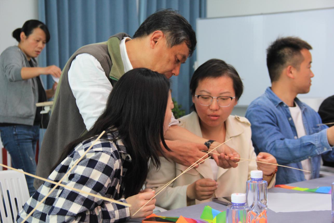 在实践活动之前,黄懿老师首先介绍了传统风筝的相关知识和细节流程。制作传统风筝,讲究“扎、糊、绘、放”四艺一体,并且详细介绍了具有地域特色的传统风筝和具有南北文化结合的龙头风筝。在实践环节中,黄老师手把手指导如何搭建风筝骨架、绳子固定、黏上绢布。老师们两两一组,从拿到竹条到绑扎定型,从开始的手足无措到手握材料时的认真笃定,每一步都凝神专注,一丝不苟。