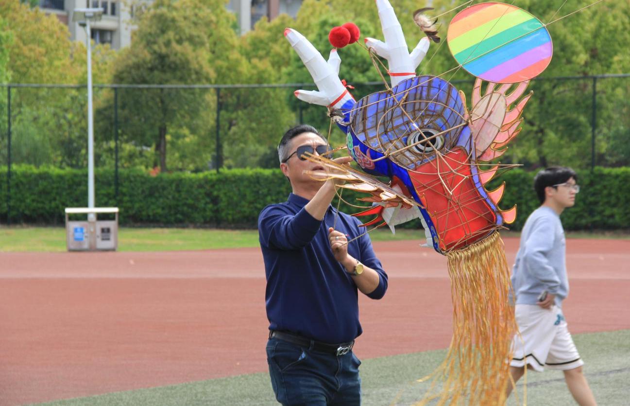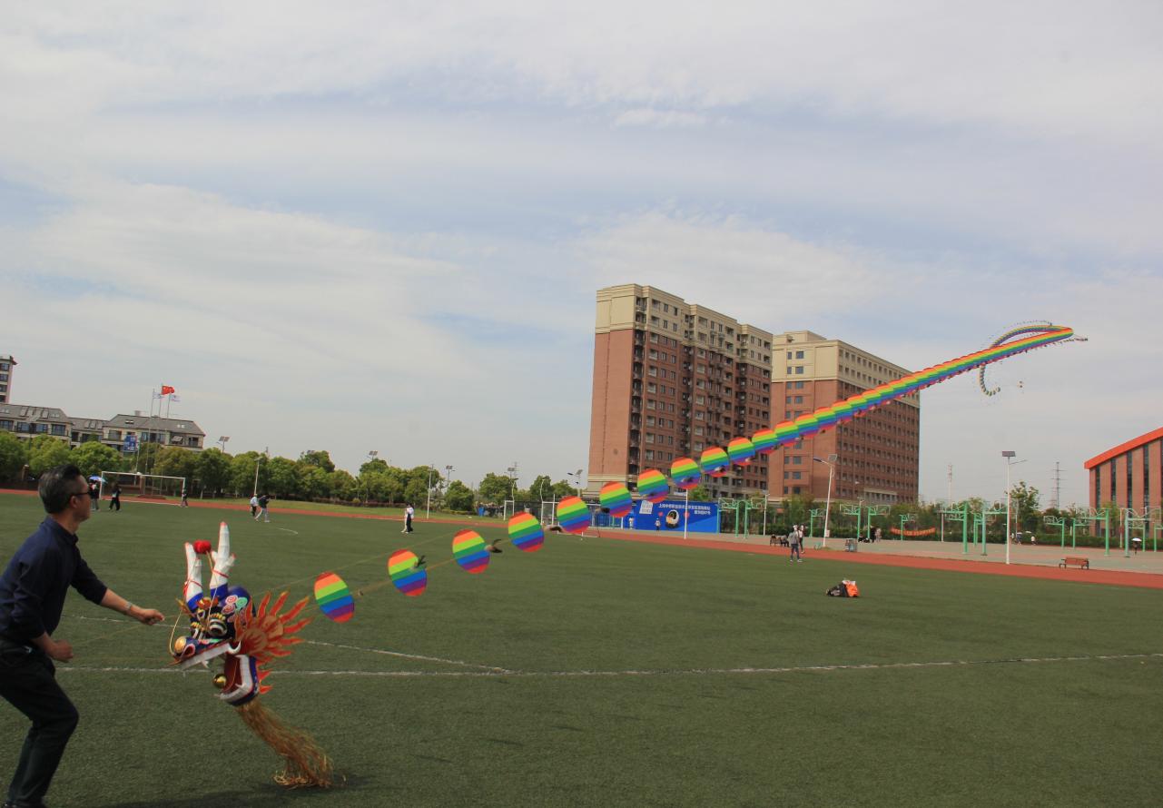 活动的最后阶段是操场上的放飞环节。老师们带着亲手制作的风筝跃跃欲试,黄懿老师则亮出“压轴之作”——一条长达12米的龙头风筝。随着黄老师助手娴熟地收放线轴,巨龙迎风而起,扶摇直上,寓意着威猛、吉祥和繁荣,舞动的巨龙风筝引来阵阵欢呼。