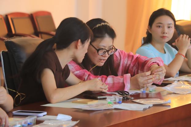 随后,老师们开始动手制作简易的景泰蓝掐丝珐琅杯垫。从掐丝、点彩到封胶,每一步都充满了挑战与乐趣。王老师穿梭在桌椅之间,不时停下脚步,为老师们提供一对一的指导,确保每个人都能掌握技巧,制作出满意的作品。通过这次活动,老师们不仅领略到了非遗文化的魅力,更在实践中体会到了传统手工艺人的不易与匠心。