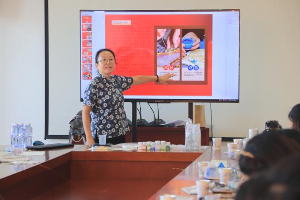 培训师王婷婷老师首先向大家详细介绍了景泰蓝掐丝珐琅的历史背景和制作工艺。景泰蓝,亦称“铜胎掐丝珐琅”,是一种特种工艺品,用细扁铜丝做线条,在铜制的胎上捏出各种图案花纹,再将五彩珐琅点填在花纹内,经烧制、磨平、镀金等多道工序而成。王老师的讲解让在场老师们对这项传统技艺有了深入的了解。