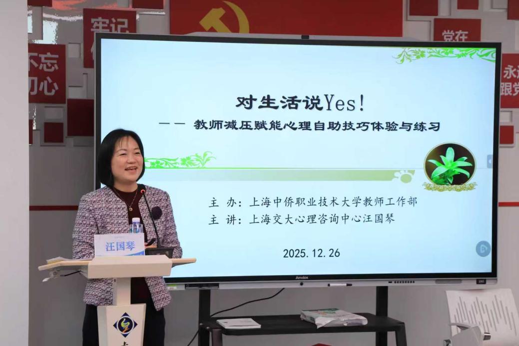 2025年12月26日下午,上海中侨职业技术大学主办“对生活说Yes!——教师减压赋能心理自助技巧体验与练习”活动在学校党建活动中心举行,上海交大心理咨询中心副主任汪国琴老师担任主讲,全校20余名教师参与。