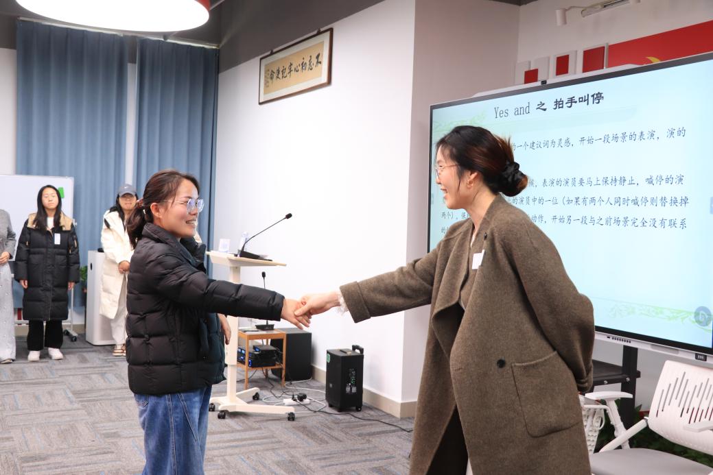 汪国琴老师首先开启了本次心理自助技巧的分享。活动的互动体验环节,教师们围坐一起进行“Yes and”即兴练习。老师们纷纷放下拘谨,积极参与,有的主动分享自己的想法,有的笑着回应同伴的建议,现场不时传来阵阵笑声。