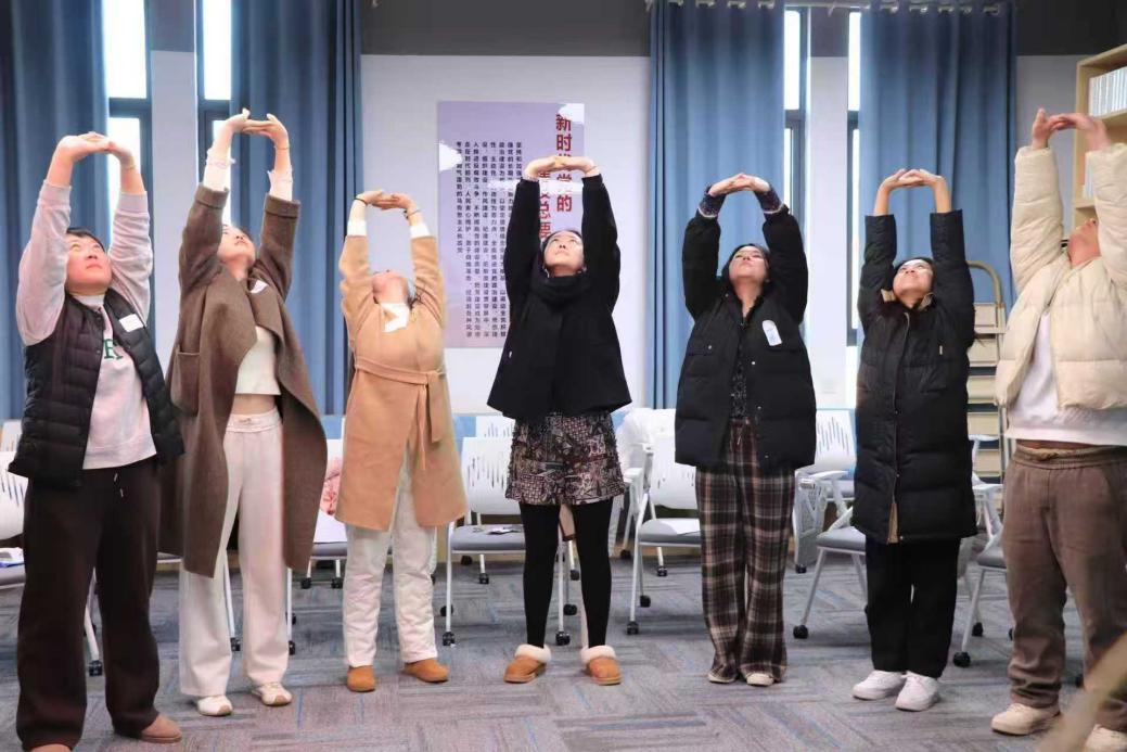 活动尾声,汪老师带领教师进行集体伸展运动。站成一排,双手举过头顶,慢慢向后仰,放松肩颈和背部。最后,全体教师围成一个圈,手搭在彼此手上,一起喊出“对生活说Yes!”的口号。活动通过体验式练习,帮助教师们掌握了“Yes and”等心理自助及解压技巧,参与活动的教师们纷纷表示,在趣味互动中重拾了轻松与活力,今后也将以更饱满的热情投入到教育教学工作中。